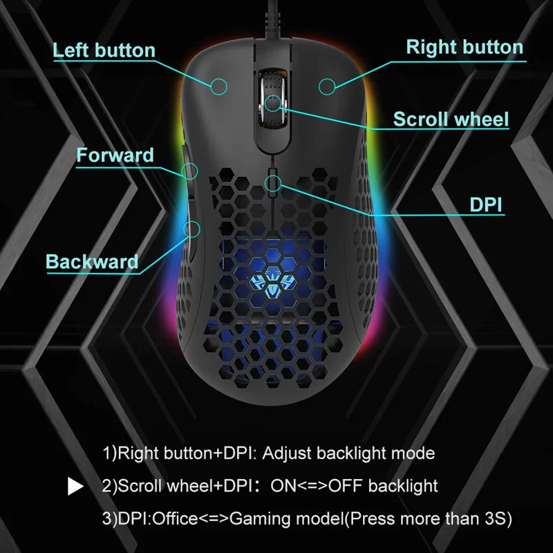 این ماوس بازی سیمی دارای 6 سطح DPI قابل تنظیم (800-1600-2400-3200-4800-6400DPI) است، می توان آن را برای بازی ها یا سناریوهای اداری مختلف تطبیق داد. ماوس قابل برنامه ریزی را می توان با 6 دکمه ماوس با نصب نرم افزار درایور برنامه ریزی کرد که باعث هوشمندتر شدن ماوس و رفع نیازهای بیشتر بازی های مختلف می شود.
